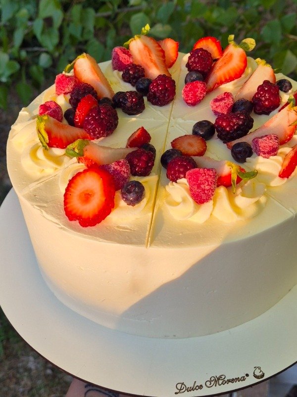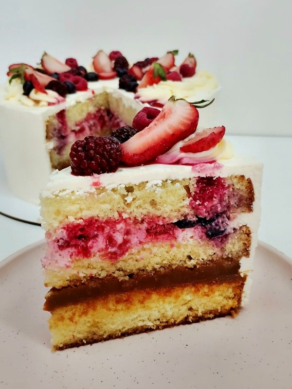 Bizcochuelo húmedo de vainilla, con un corte de crema con frutos rojos y otro de Dulce de leche. Decorada con buttercream y frutos rojos. Precio publicado corresponde a Torta de 18cm de diámetro: 2kg.